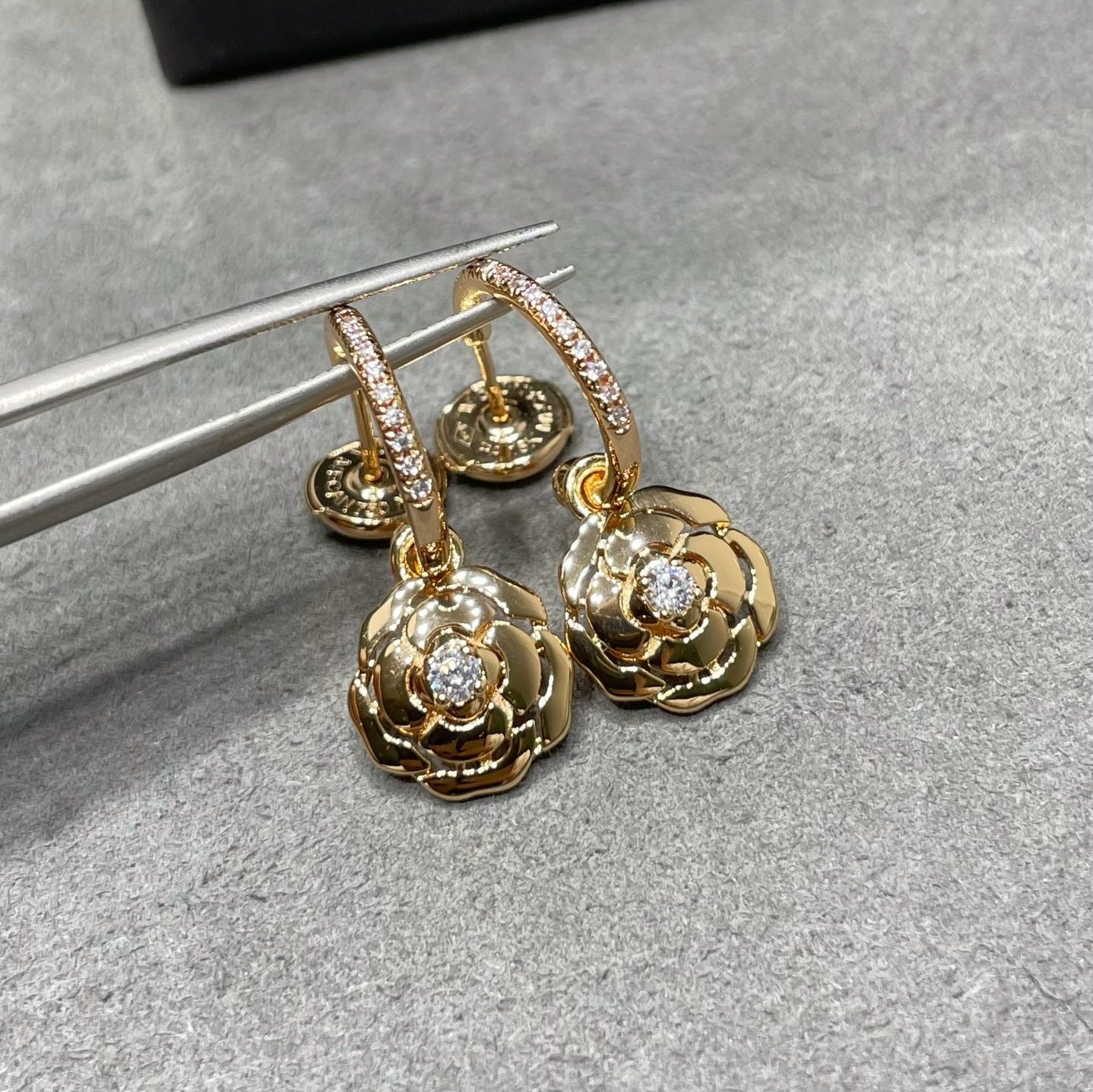 V Gold base, 18K gold plated, PVD 5x layered, Camélia flower pendant with zirconia, elegant women’s earrings.